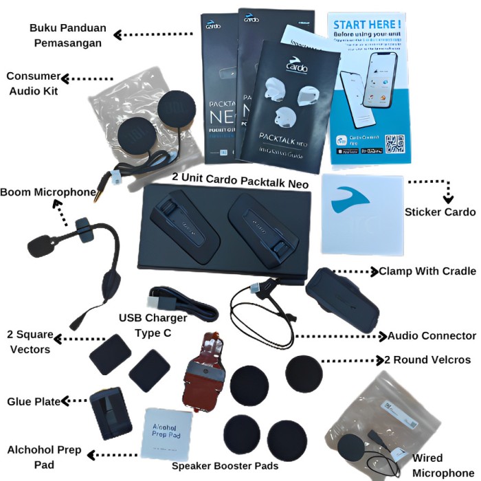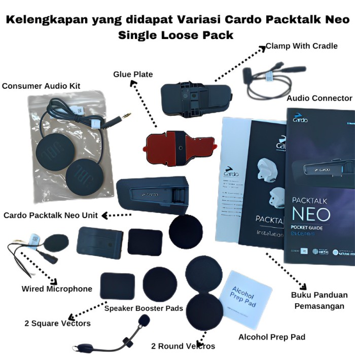 Rp2.706.000 – Rp11.572.000Rentang harga: Rp2.706.000 hingga Rp11.572.000Intercom Cardo Packtalk Neo Bluetooth Helmet Communication *Setiap pembelian Intercom Helm Cardo Packtalk akan mendapatkan merchandise menarik dari Digioto !!! Ayo segera beli dan dapatkan hadiahnyaa !!! Persediaan terbatasss (tidak berlaku untuk pembelian Clampkit Only) Kelengkapan Yang di dapat : – Clampkit Only : Hanya mendapatkan Clampkit Neo saja beserta kelengkapannya (VARIASI INI TIDAK MENDAPAT INTERCOMNYA YAAA) – Single Loose Pack : Mendapatkan Intercom Neo 1pcs beserta kelengkapan nya (tidak termasuk dus kotak/packingan) – Duo : Mendapatkan Intercom Neo 2pcs beserta kelengkapan nya,dus kotak/packingan *Setiap pembelian Cardo Packtalk Neo Single/Duo sudah include Clampkit, tetapi jika ingin membeli Clampkit tambahan silahkan Check Out pada Variant Clampkit Only. Note : Harap memperhatikan variasi yang dipilih sebelum melakukan pemesanan, jika ingin mengetahui denga pasti harga Intercom dapat ditanyakan terlebih dahulu kepada admin GARANSI RESMI PT.PAS Ciri2 produk yg diimport oleh PT.PAS : 1. Di setiap device terdapat hologram PT.PAS (untuk klaim warranty) 2. Di setiap kotak ada kode QR, DePostel PT.PAS 3. Di kotak terdapat stiker “Cardo Gift” (Khusus edisi terbatas untuk PT Edge Single / Duo) WATERPROOF. No matter what you throw at it, your waterproof PACKTALK NEO will take the beating and keep you connected. Rain, shine, mud, dust or snow. SOUND BY JBL. New and powerful 40mm high-definition speakers engineered to perfection by JBL experts, with an improved music processor and three redesigned audio profiles. NATURAL VOICE. Our improved Natural Voice Operation engine rids you from the need to ever press a button again. Just say “hey Cardo” and tell it what you want, your PACKTALK NEO will do the rest. *Harap perhatikan variasi yang dipilih dan Harap tanyakan stock terlebih dahulu sebelum melakukan pemesanan yaa..
